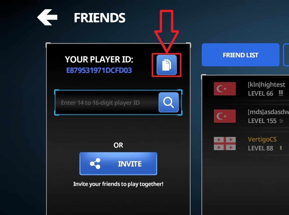 After clicking the ⚙️ icon in the top left, you can see your Player ID by checking the bottom left of the screen. If this method is confusing, you can try the following: while on the main menu, clicking on your name will take you to your profile page. You can see and copy your player code above your K/D ratio with a single tap.
